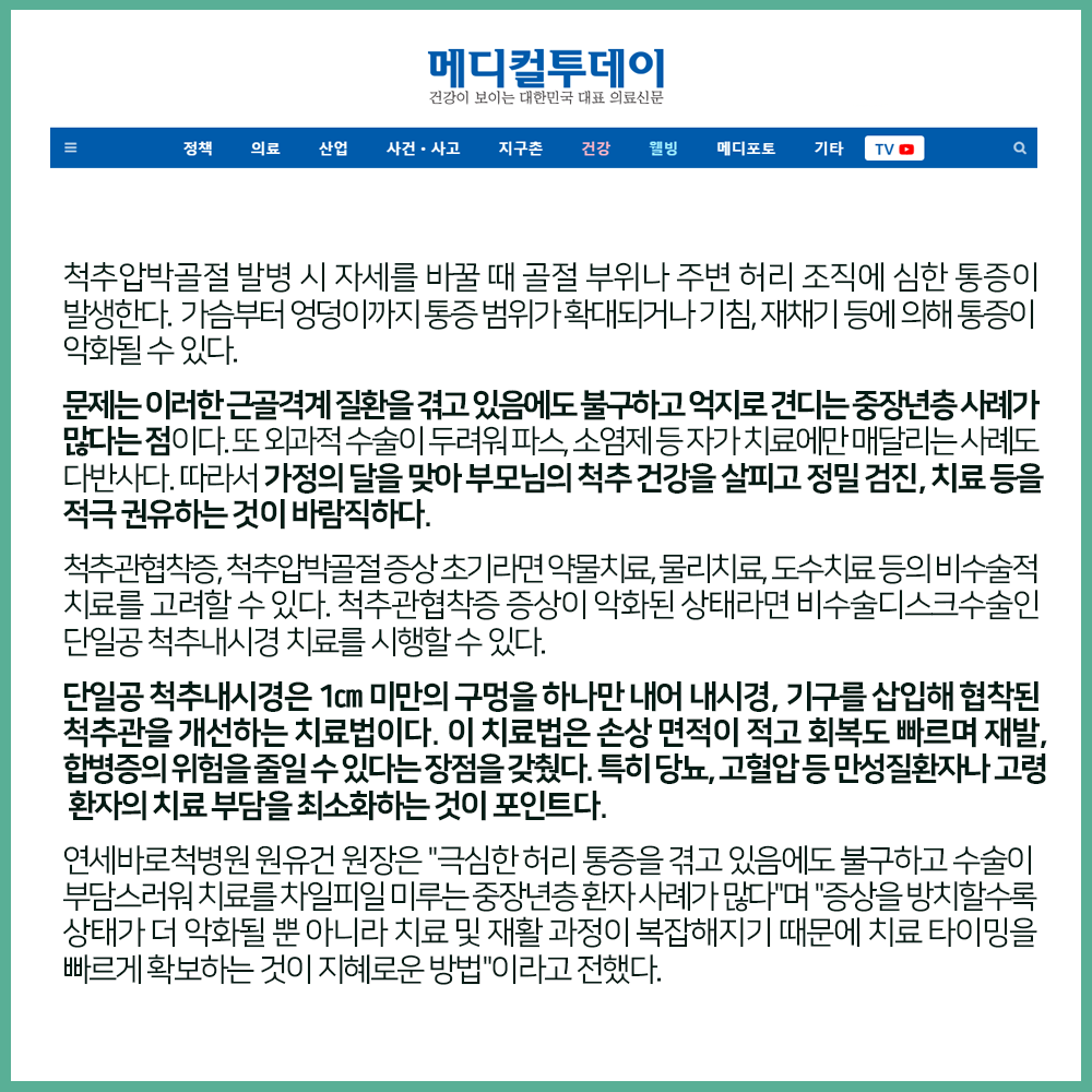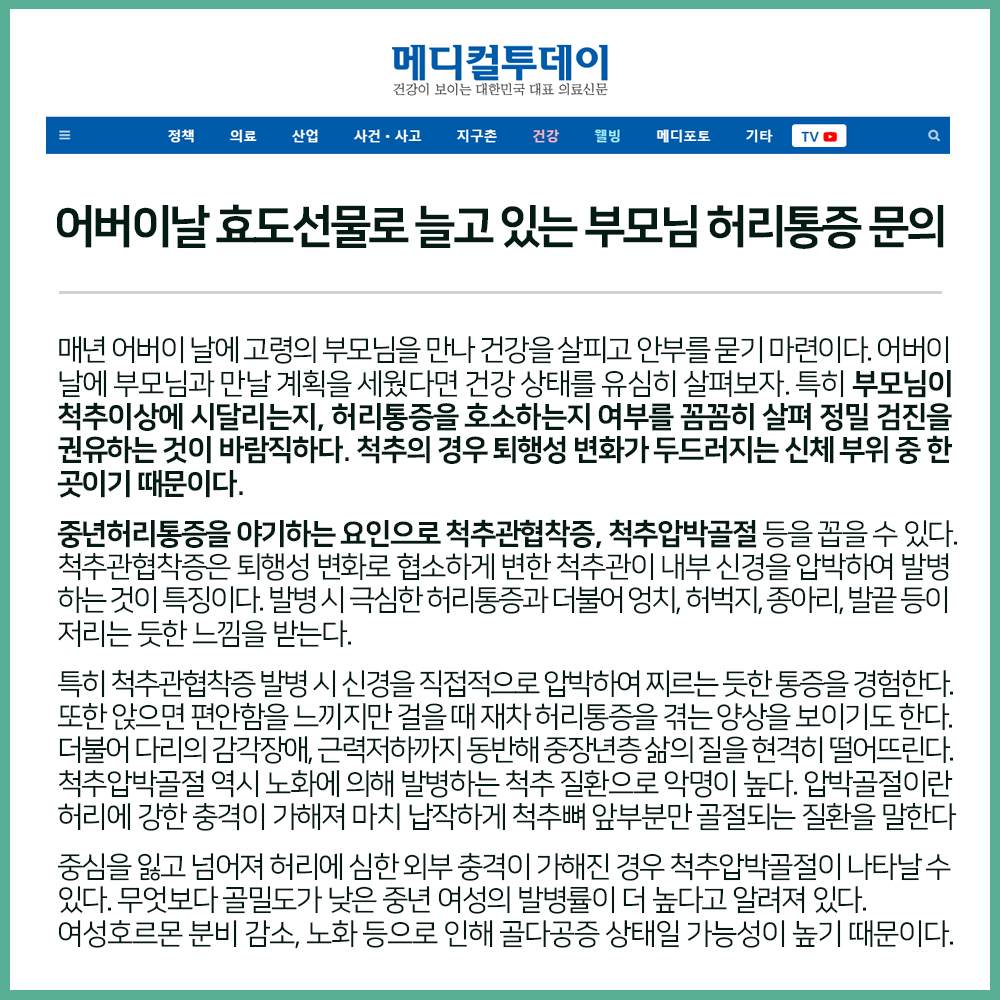 [보도자료] 어버이날 효도선물로 늘고있는 부모님허리통증 치료문의