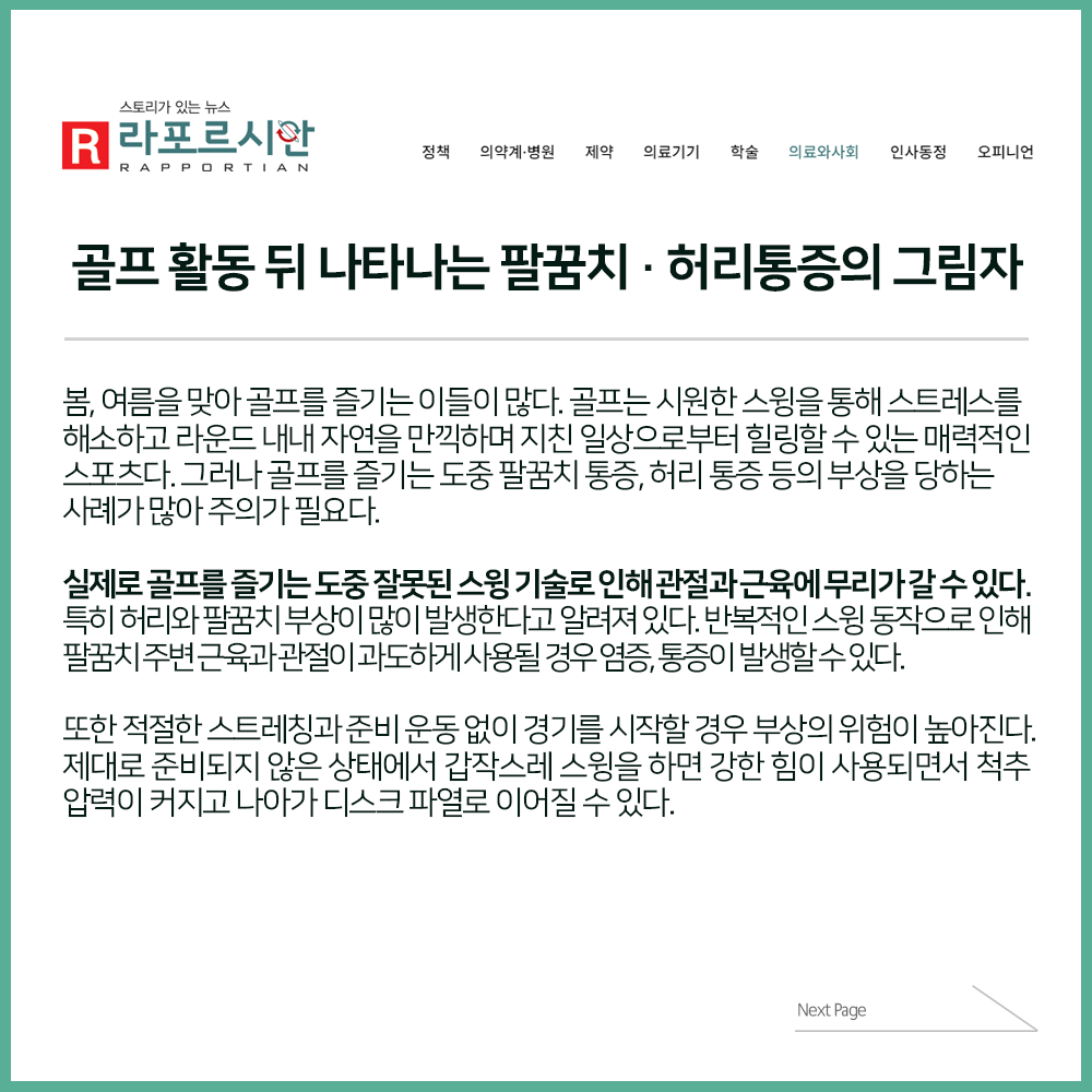 [보도자료] 골프활동 뒤 나타나는 팔꿈치·허리 통증의 그림자