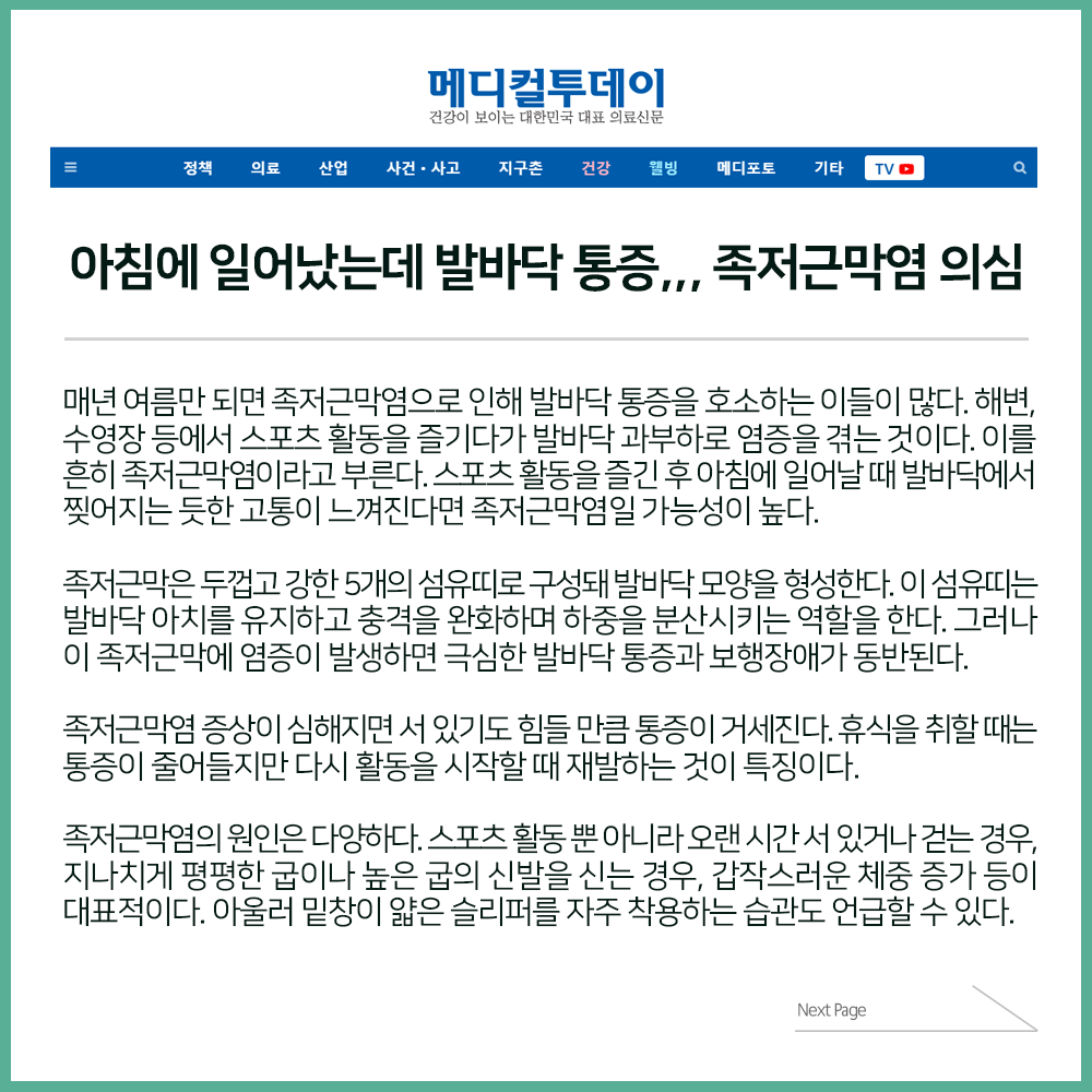[보도자료] 아침에 일어났는데 발바닥 통증,,, 족저근막염 의심