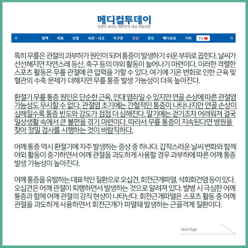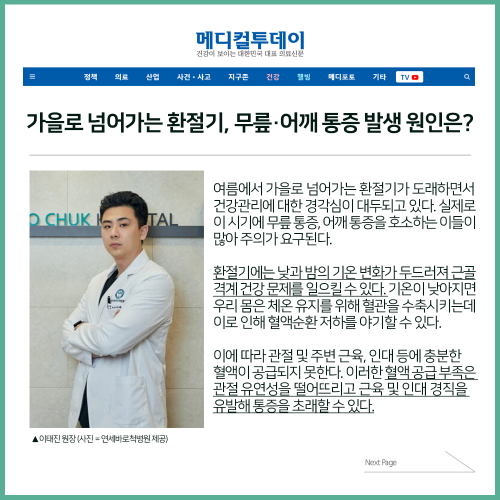 [보도자료] 가을로 넘어가는 환절기, 무릎·어깨 통증 발생 원인은?