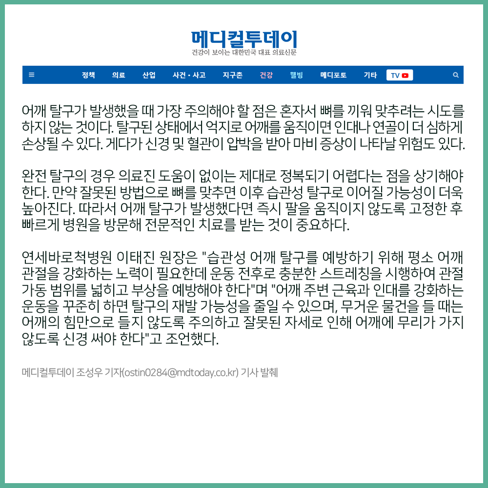 [보도자료] 반복적인 습관성 어깨 탈구 주의!