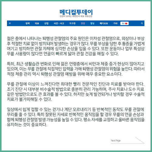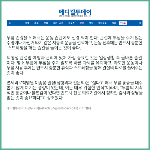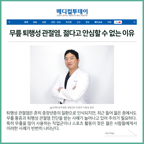 [보도자료] 무릎 퇴행성 관절염, 젊다고 안심할 수 없는 이유는?