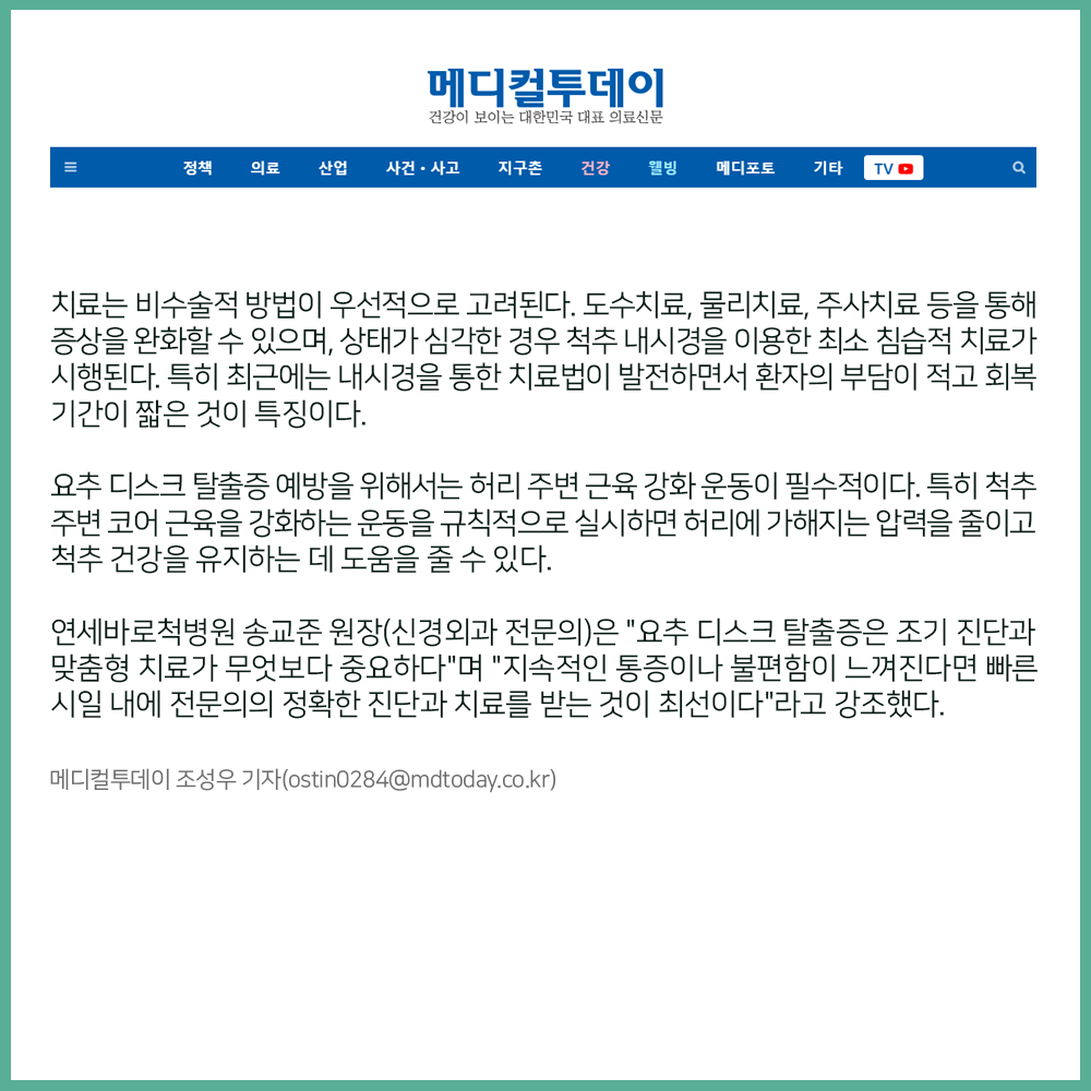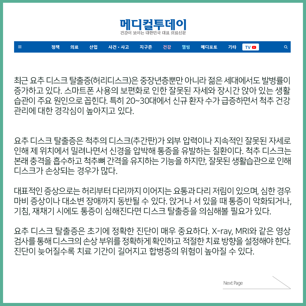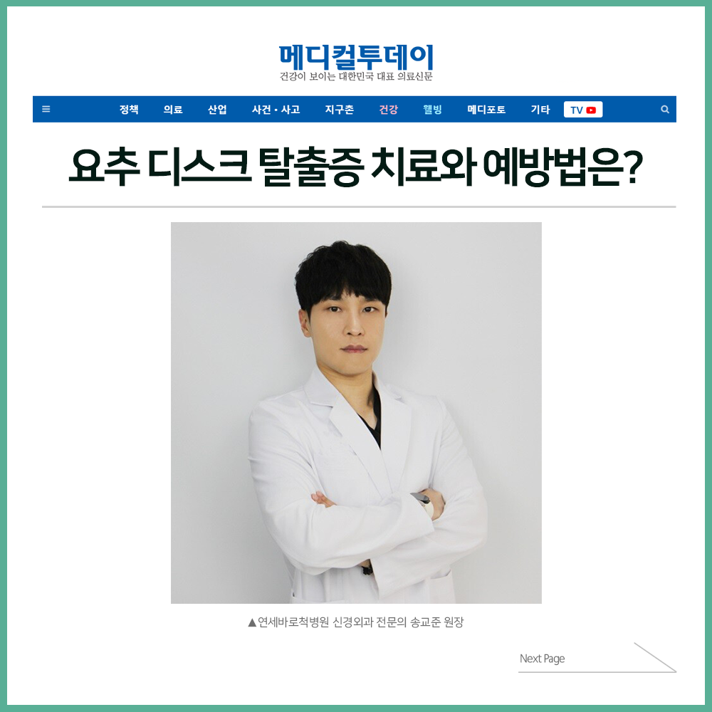 [보도자료] 요추 디스크 탈출증 치료와 예방법은?