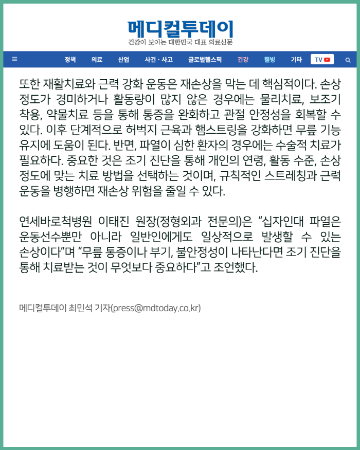 [보도자료] 십자인대 파열, 운동선수만의 부상 아닌 일상 취미로도 발생