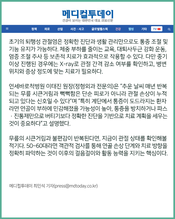 회원은 연세바로척병원에서 수집하는 개인정보에 대해 동의를 거부할 권리가 있으며 동의 거부 시에는 회원 가입, 진료 예약, 게시판 이용 등의 서비스가 제한됩니다.