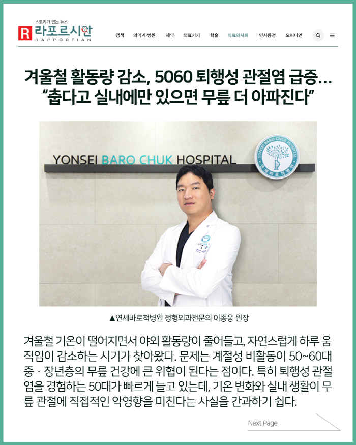 겨울철 활동량 감소, 5060 퇴행성 관절염 급증...“춥다고 실내에만 있으면 무릎 더 아파진다”