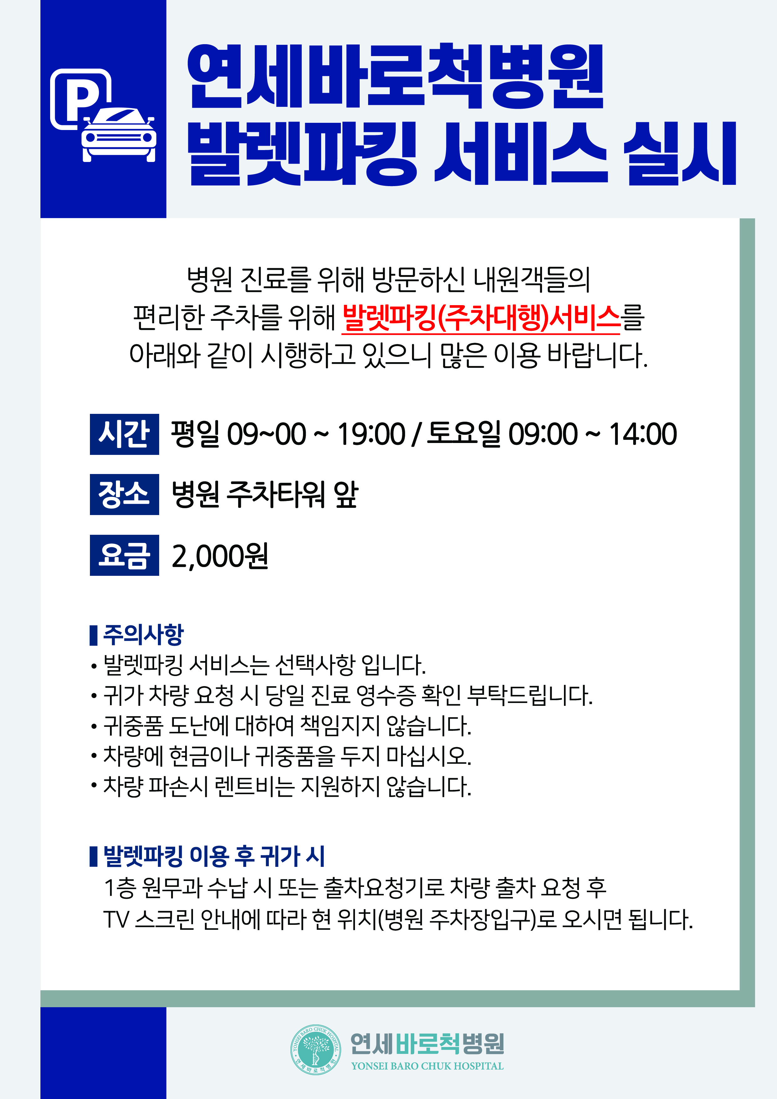 연세바로척병원 주차대행(발렛파킹) 서비스 안내
