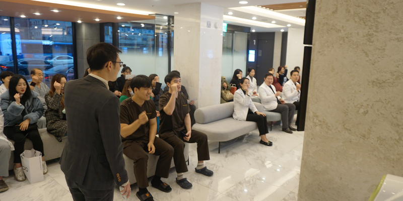 개원 후 한달 간 진행되었던 이벤트를 경청하고 있는 원장님과 직원분들의 담대한 대화를 나누는 모습입니다.