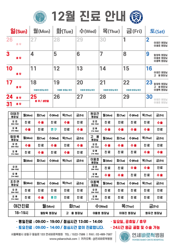연세바로척병원 2023년 12월 진료일정