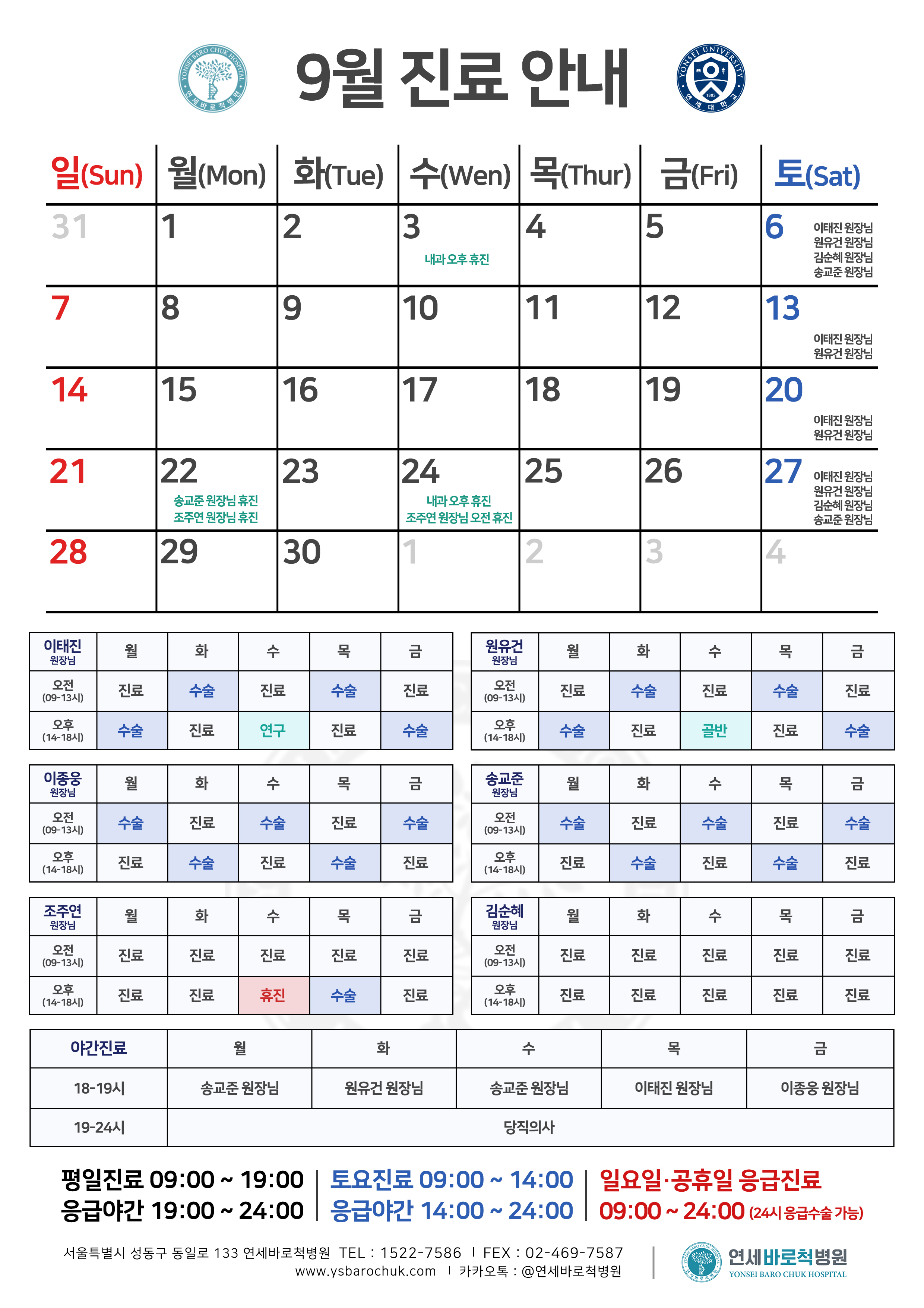 연세바로척병원 2025년 9월 진료일정