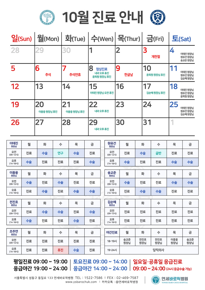 연세바로척병원 2025년 10월 진료일정