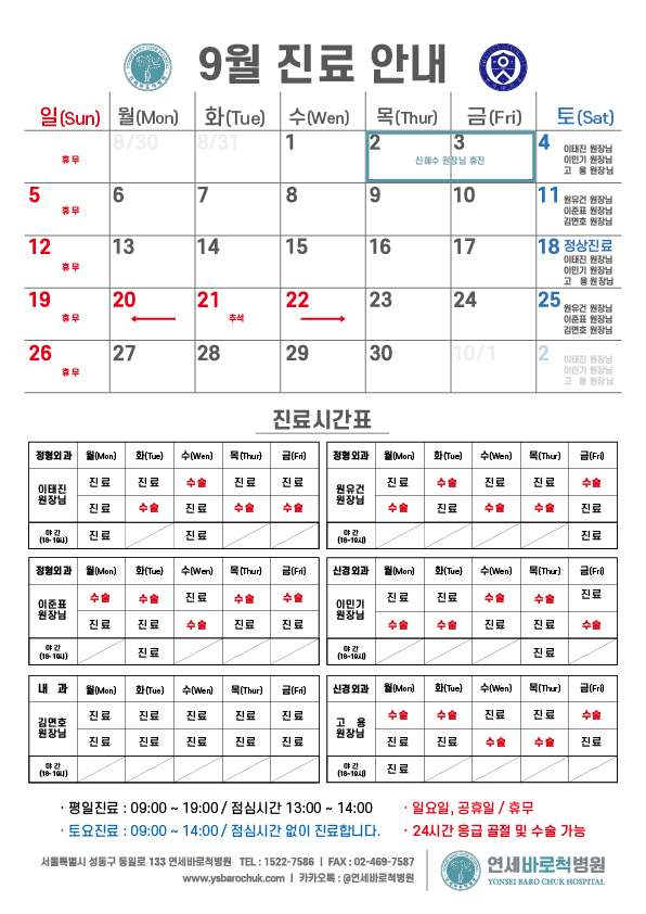 연세바로척병원 2021년 9월 진료일정