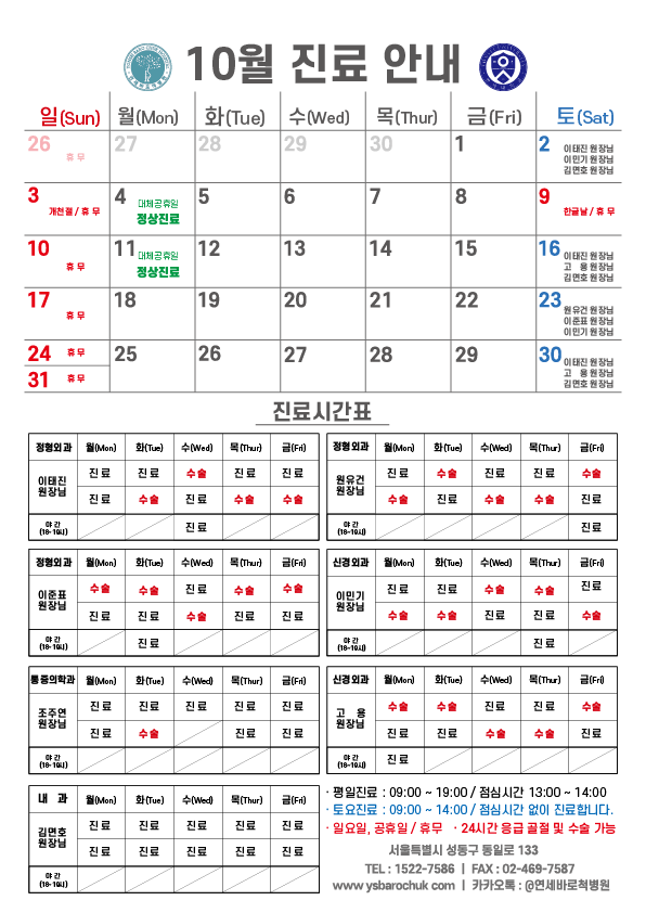 연세바로척병원 2021년 10월 진료일정