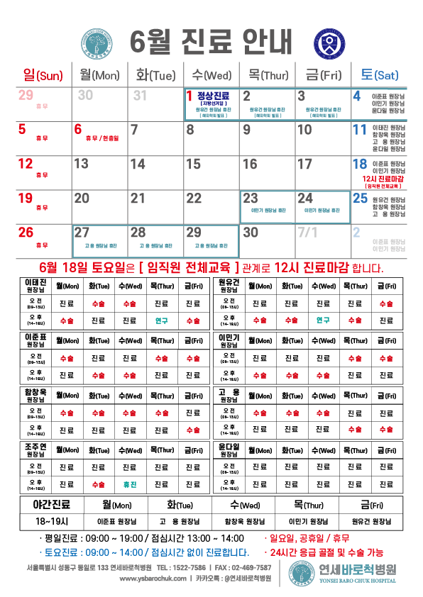 연세바로척병원 2022년 06월 진료일정