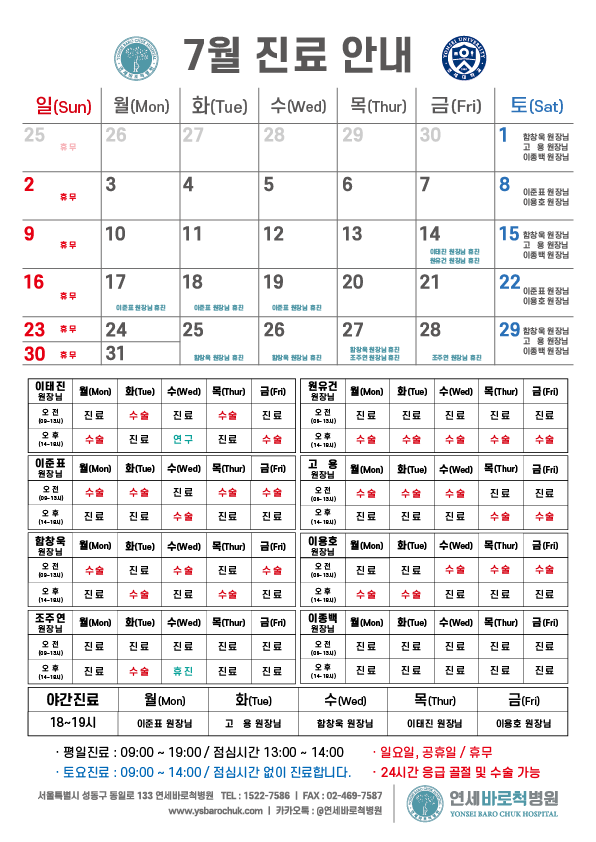 연세바로척병원 2023년 07월 진료일정