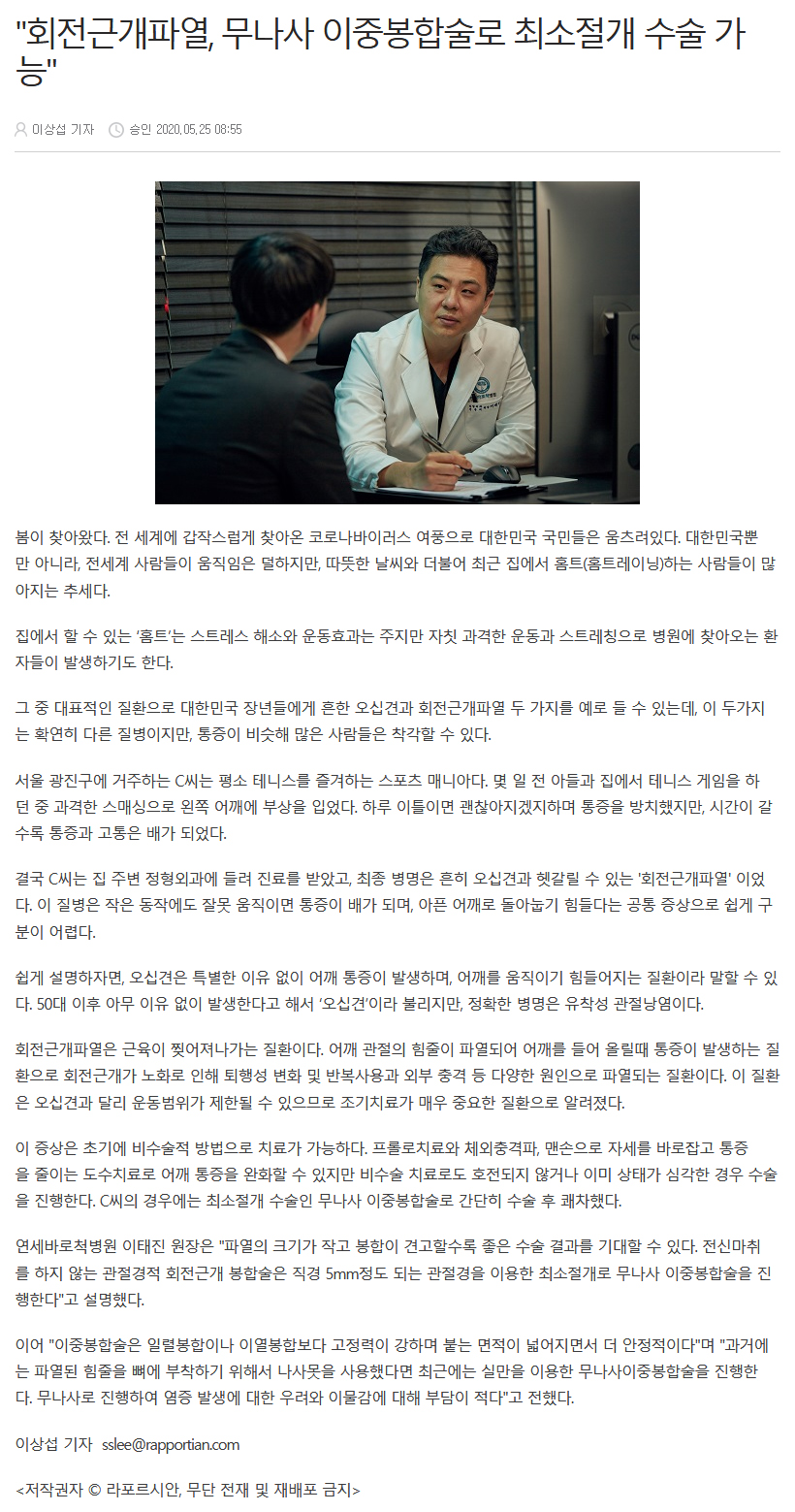 이 증상은 초기에 비수술적 방법으로 치료가 가능하다. 프롤로치료와 체외충격파, 맨손으로 자세를 바로잡고 통증을 줄이는 도수치료로 어깨 통증을 완화할 수 있지만 비수술 치료로도 호전되지 않거나 이미 상태가 심각한 경우 수술을 진행한다. C씨의 경우에는 최소절개 수술인 무나사 이중봉합술로 간단히 수술 후 쾌차했다.