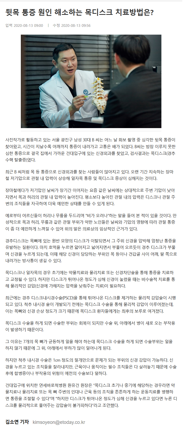 사진작가로 활동하고 있는 서울 광진구 남성 30대 B 씨는 어느 날 화보 촬영 중 심각한 뒷목 통증이 찾아왔고, 시간이 지날수록 어깨까지 통증이 내려가고 고통은 배가 되었다. B씨는 밤잠 이루지 못한 심한 통증으로 결국 집에서 가까운 건대입구에 있는 신경외과를 찾았고, 검사결과는 목디스크(경추 수핵 탈출증)였다.