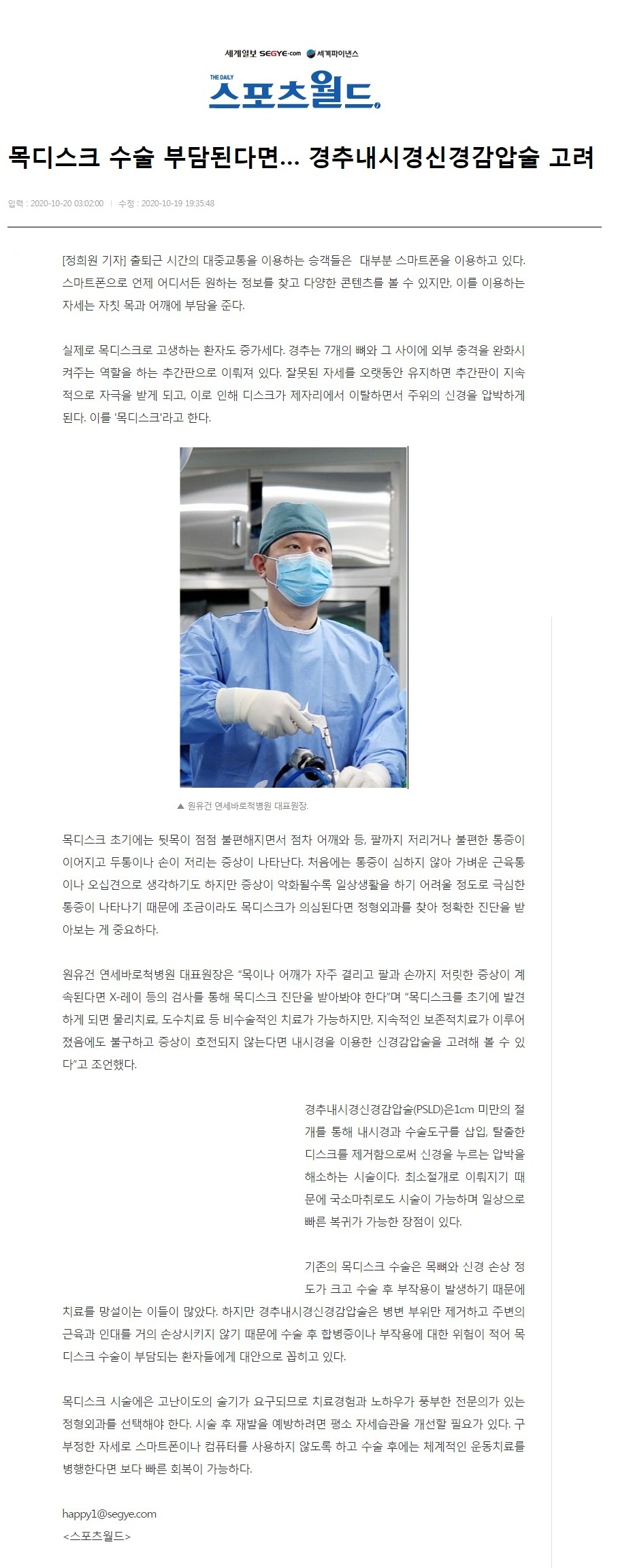 [보도자료] 목디스크 수술 부담된다면... 경추내시경신경감압술 고려