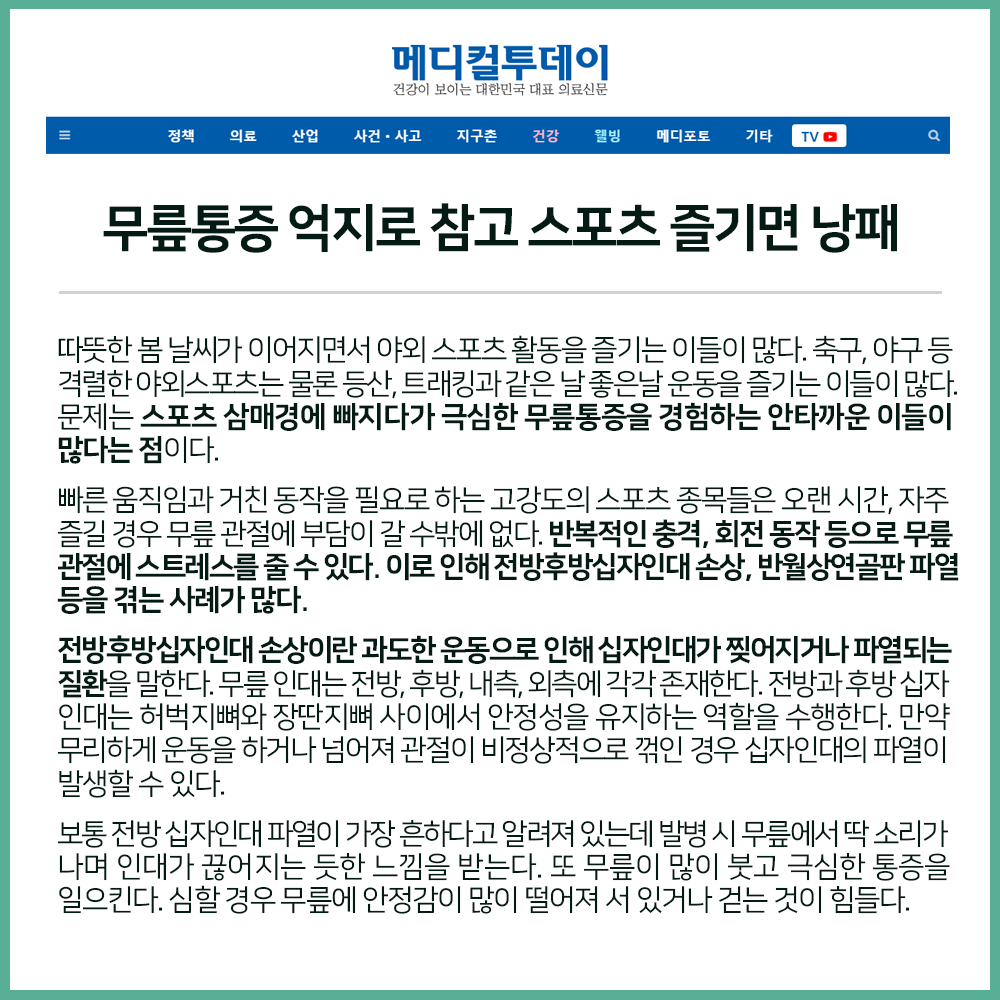 [보도자료] 무릎통증 억지로 참고 스포츠 즐기면 낭패