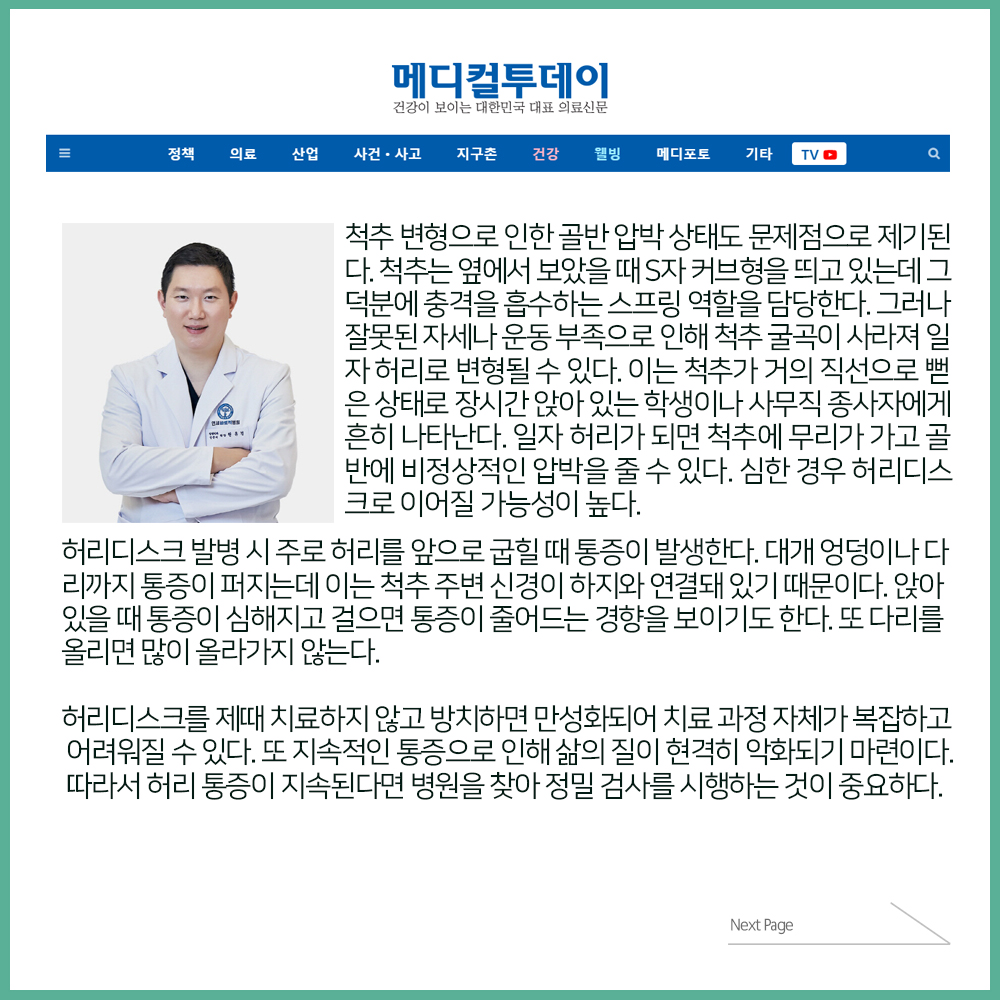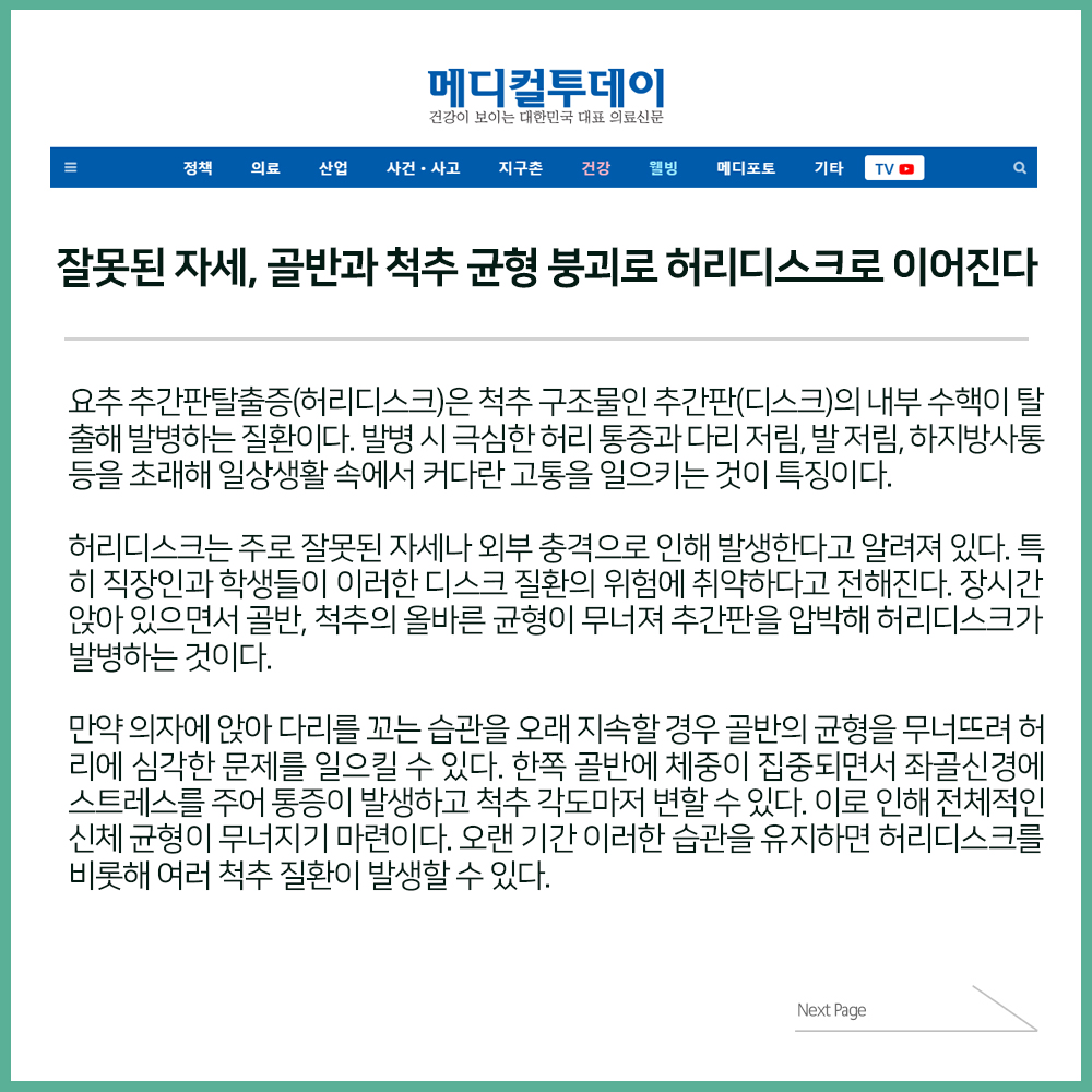 [보도자료] 잘못된 자세, 골반과 척추 균형 붕괴로 허리디스크로 이어져