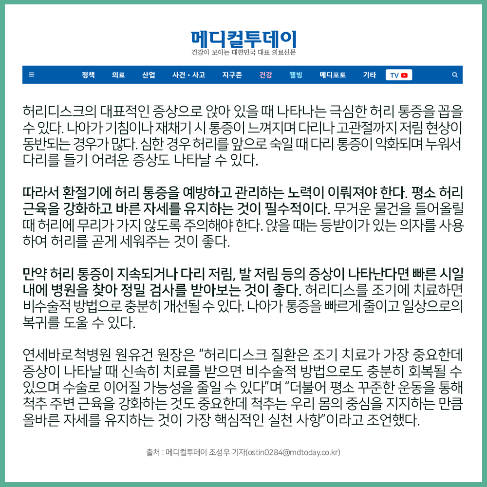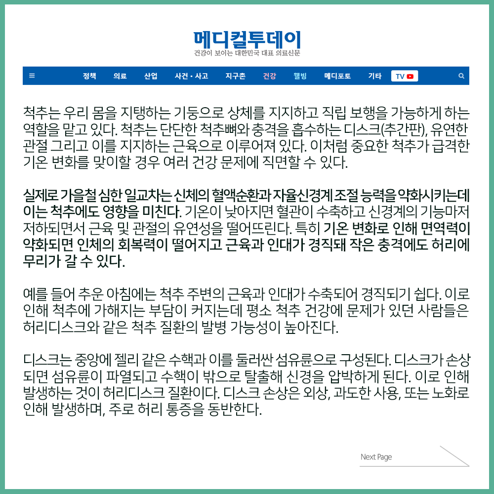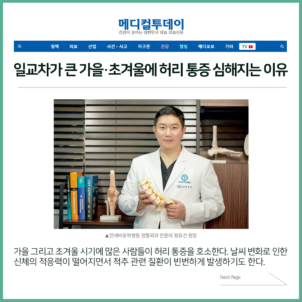 [보도자료] 일교차가 큰 가을·초겨울에 허리 통증 심해지는 이유