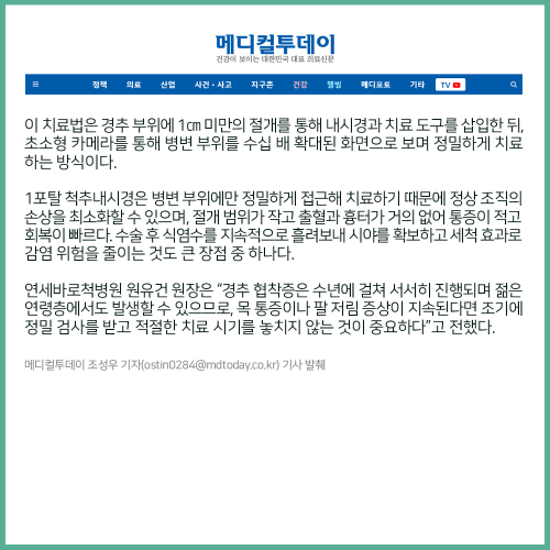 [보도자료] 경추 추간공 협착증, 척추내시경으로 효과적 해결
