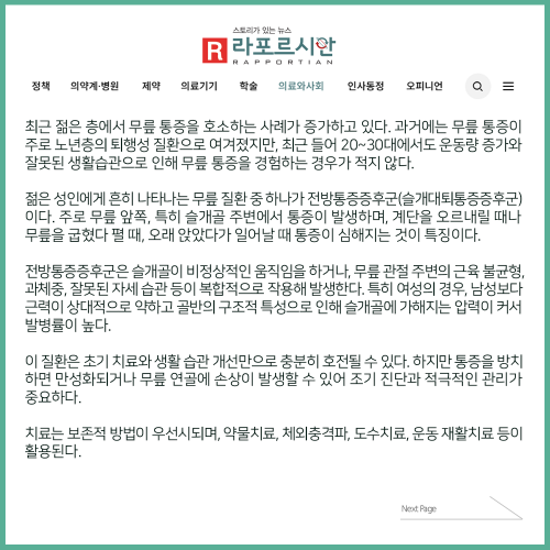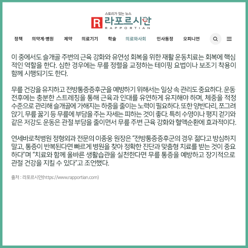 [보도자료] 젊은데 무릎 통증으로 움직임 제한? ‘전방통증증후군’ 의심해봐야