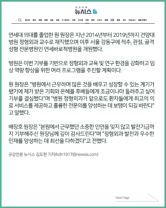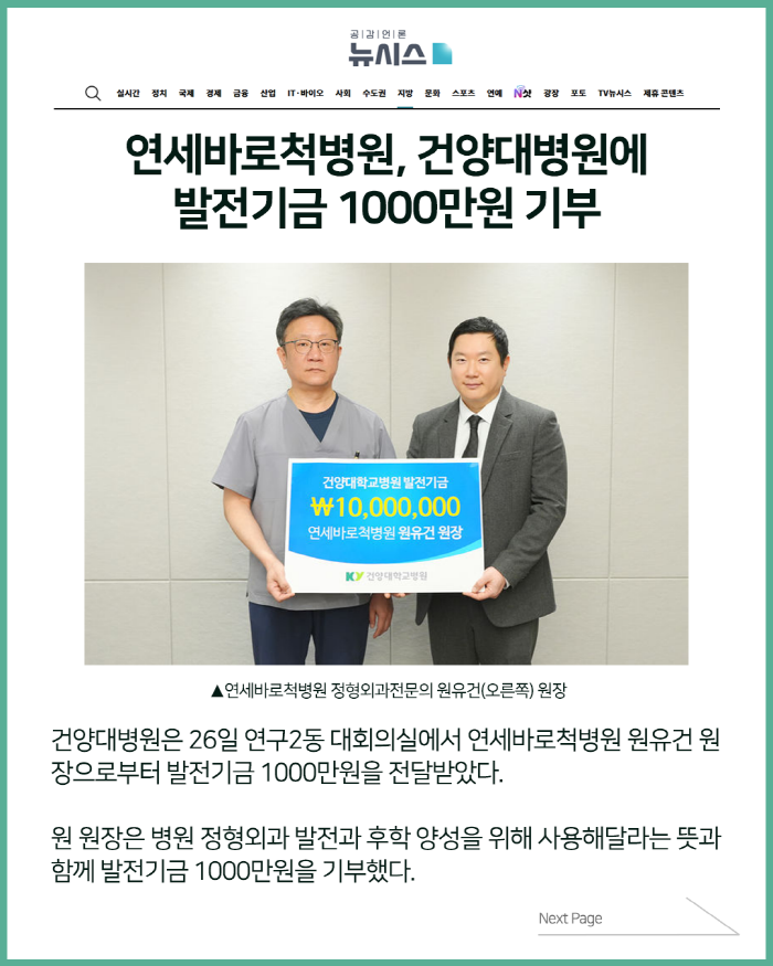 연세바로척병원, 건양대병원에 발전기금 1000만원 기부