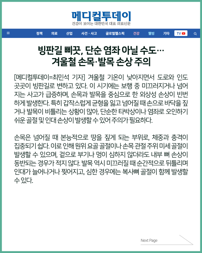 빙판길 삐끗, 단순 염좌 아닐 수도… 겨울철 손목·발목 손상 주의