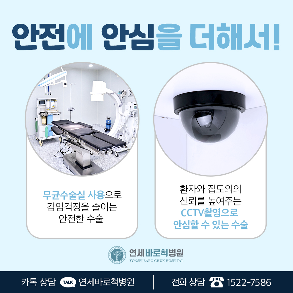 연세바로척병원은 무균수술실을 사용하기 때문에 감염의 위험성이 낮습니다.