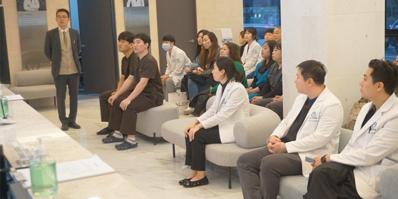 개원 후 한달 간 진행되었던 이벤트를 경청하고 있는 원장님과 직원분들의 담대한 대화를 나누는 모습입니다.